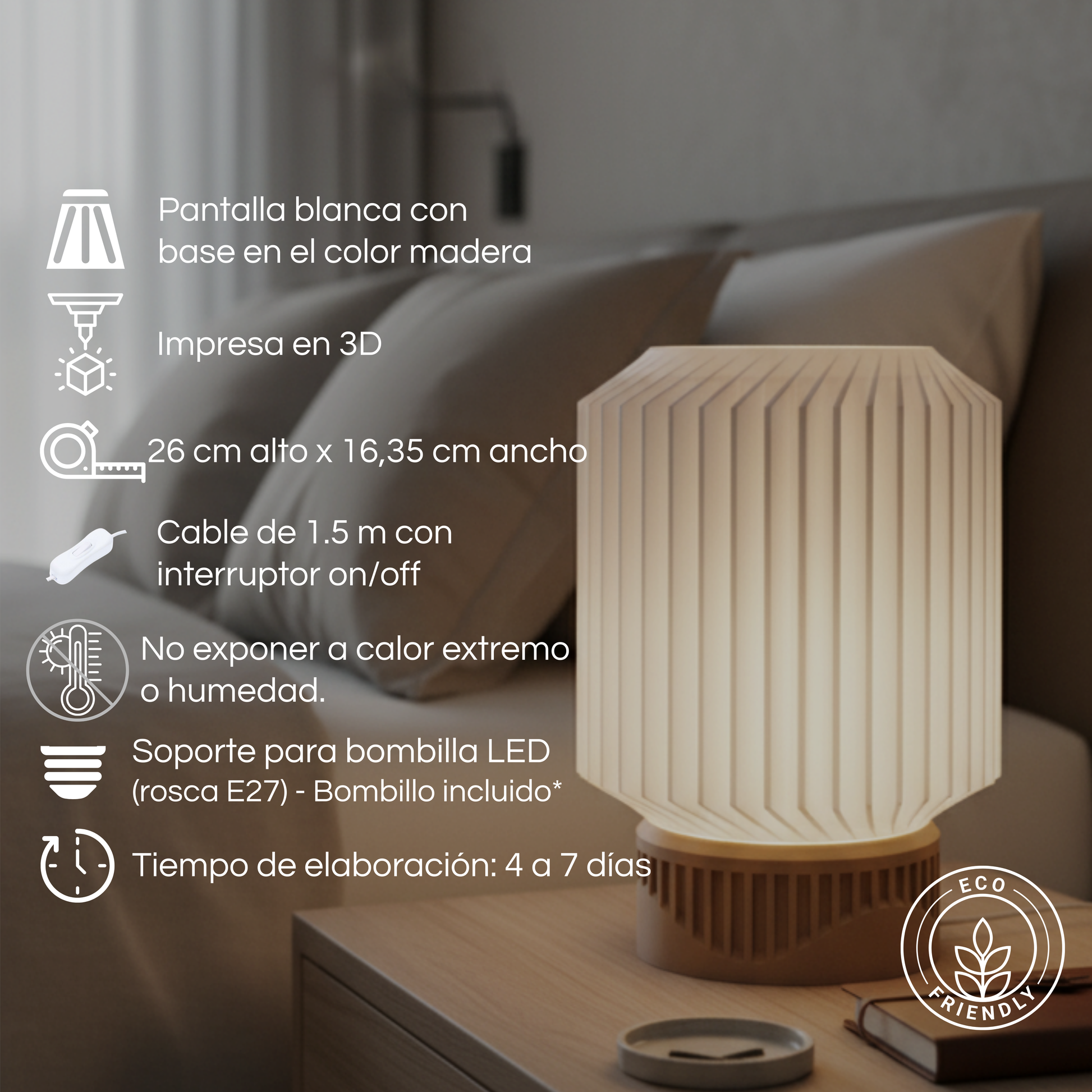 - ☀️ Mantén la lámpara alejada de fuentes de calor extremo o exposición solar directa prolongada (el PLA puede deformarse a temperaturas superiores a 60 °C).